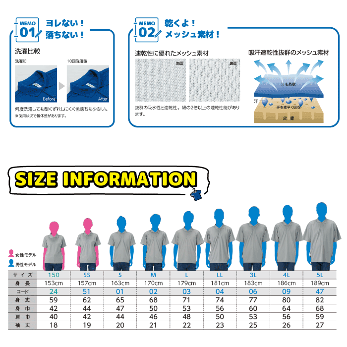 商品詳細 ポリエステル・メッシュ素材で、抜群の吸汗性と速乾性! 単色ですが、圧倒的なカラーとサイズのラインナップ! 職場のユニフォーム!!スポーツの移動着!!などなど、様々なお客様に対応させていただいております!! 文化祭や体育祭・スポーツチームの移動着・お店のスタッフユニフォーム・イベントになど、多様性があります!! ※一枚から、プリント可能です。